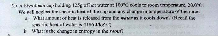 Source: https://www.numerade.com/ask/question/3-a-styrofoam-cup-holding-125g-ofhot-water-at-100pc-cools-to-room-temperature-2009c-we-will-neglect-the-specific-heat-of-the-cup-and-any-change-in-temperature-of-the-room-what-amount-of-heat-54995/